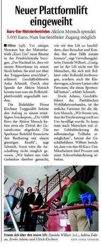 Bei Kurz Um sind Räume barrierefrei erreichbar. Der neue Plattform-Lift bringt Kunden, Mitarbeiter oder Gäste auch in den ersten Stock, wo sich u.a. die Büros und Besprechungsräume befinden. Artikel aus der Neuen Westfälischen.